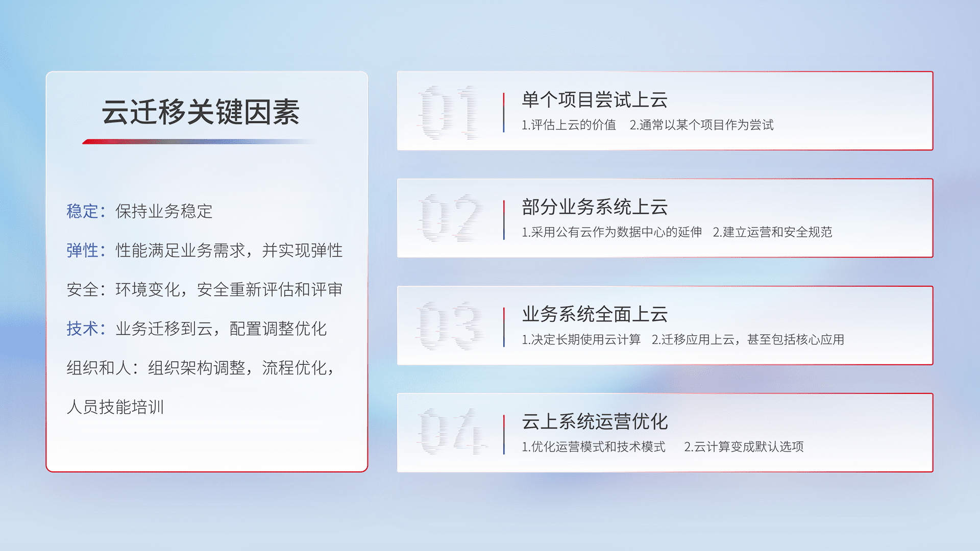 结合实际业务,,,从规划设计、、、云平台选型、、、、云原生改造、、数据迁移、、集成交付,,,,迁移全过程为客户识别最佳上云路径,,,做好风险识别管理,,,,设计网络架构、、、身份权限、、、、安全审计合规、、操作审计、、、、日志审计、、、监控告警策略、、多站点容灾设计等,,,,对云上基础设施进行整体规划,,,提升IT治理水平,,以满足弹性、、、高可用、、高性能的需求。。。